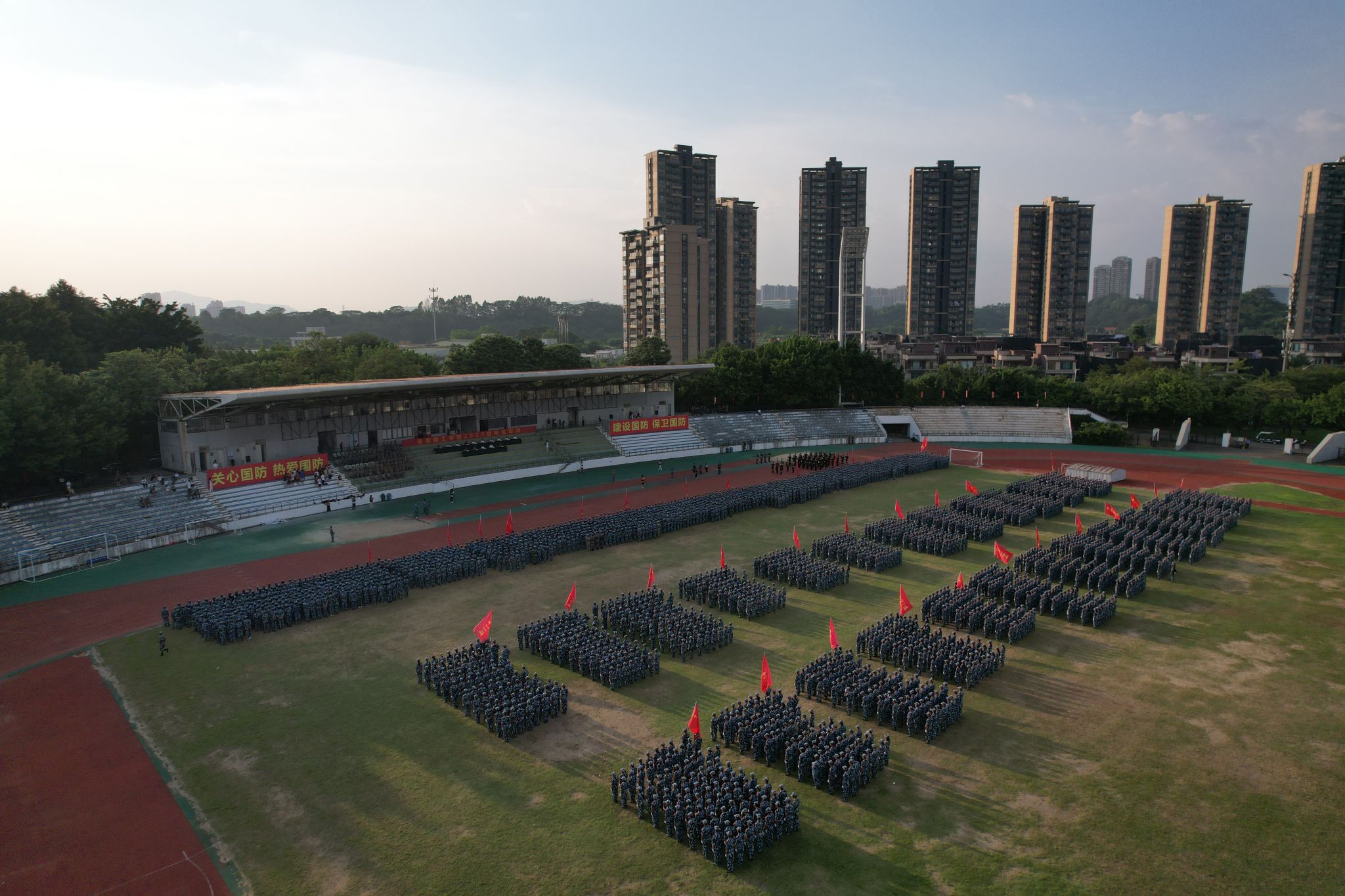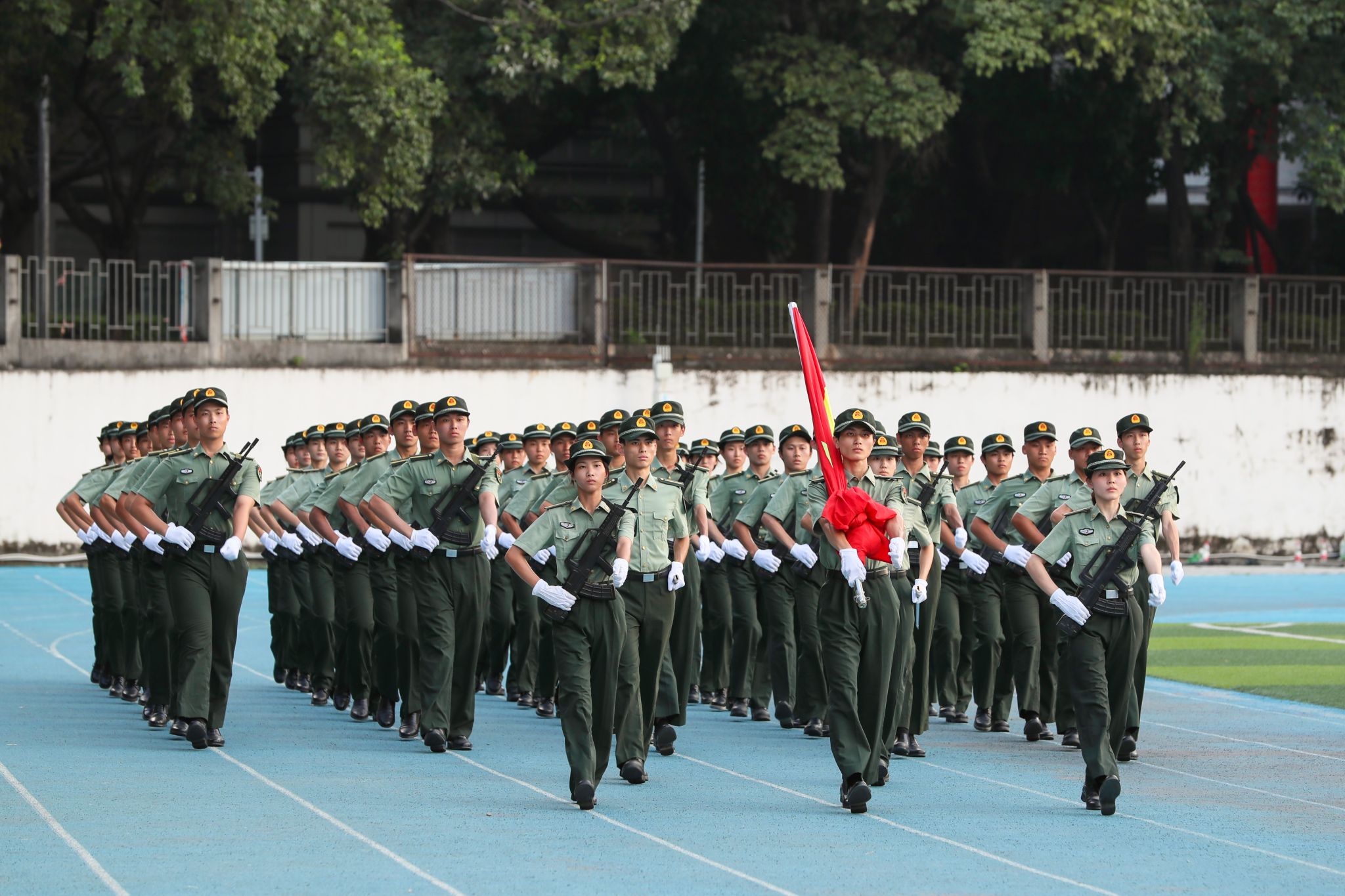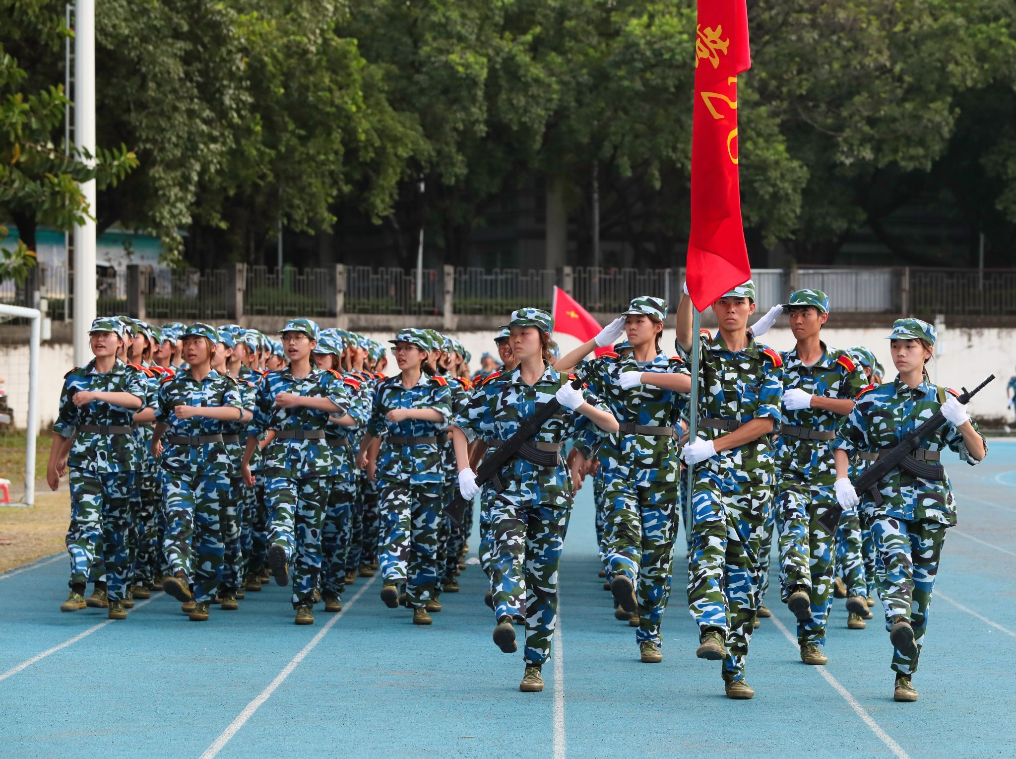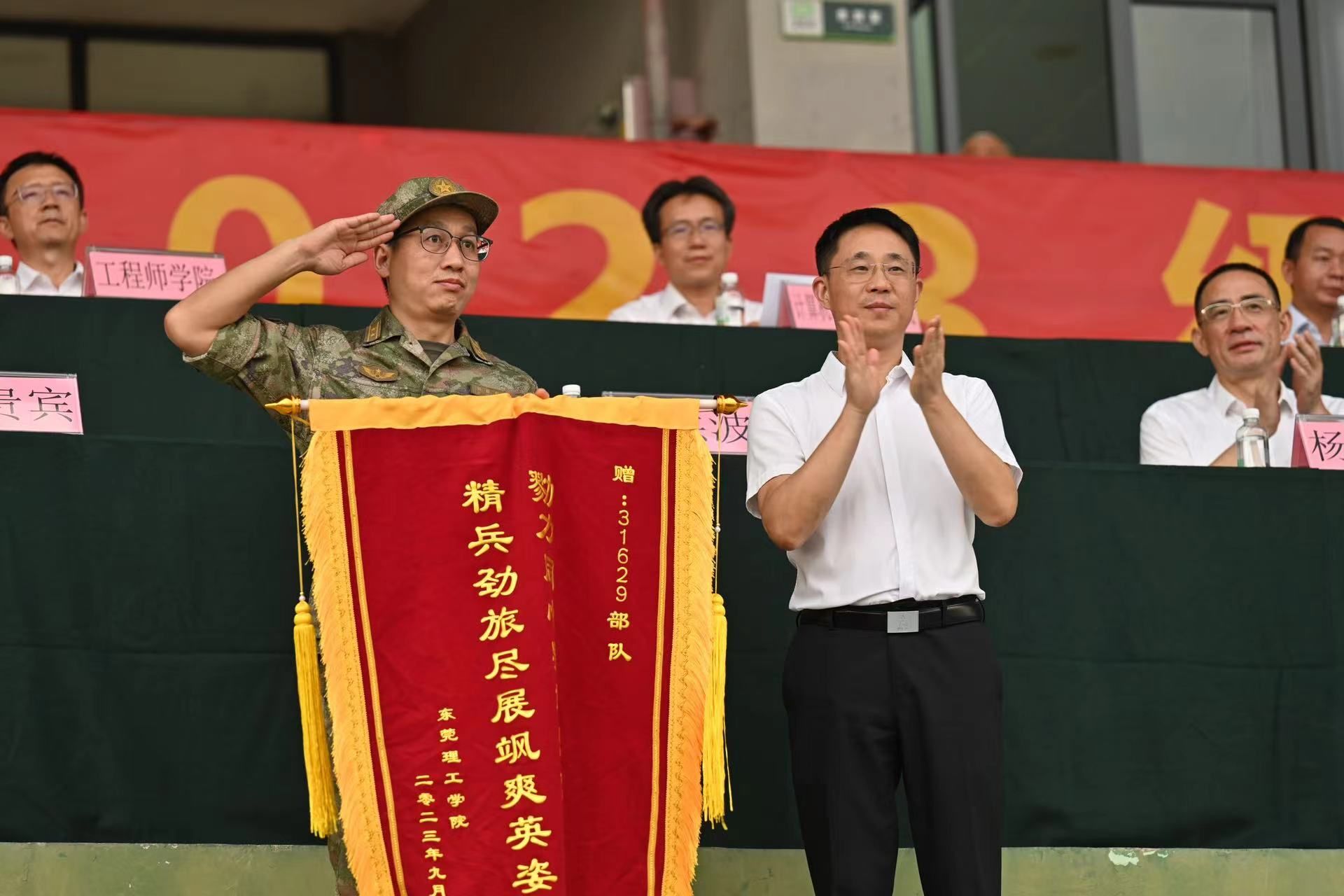 27日下午,两校区田径运动场气氛热烈,红色营旗在风中飞扬,整齐划一的迷彩队伍尽显风采。校党委书记、军训工作领导小组组长成洪波,校党委副书记、军训旅政委李忠红,校党委委员、副校长、军训旅旅长杨敏林,校党委委员、副校长李文芳,各二级学院党委书记,军训旅有关负责同志,各营教导员,连指导员参加本次大会,检阅全体新生的军训成果。