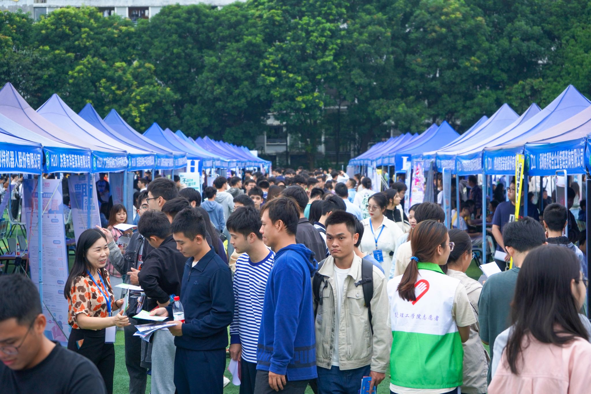 上午10:30,招聘会迎来人流量高峰期,不少用人单位的展位前排起了长龙。蓝色帐篷下,学生与企业招聘人员围绕岗位需求、薪资等问题进行一对一交流。