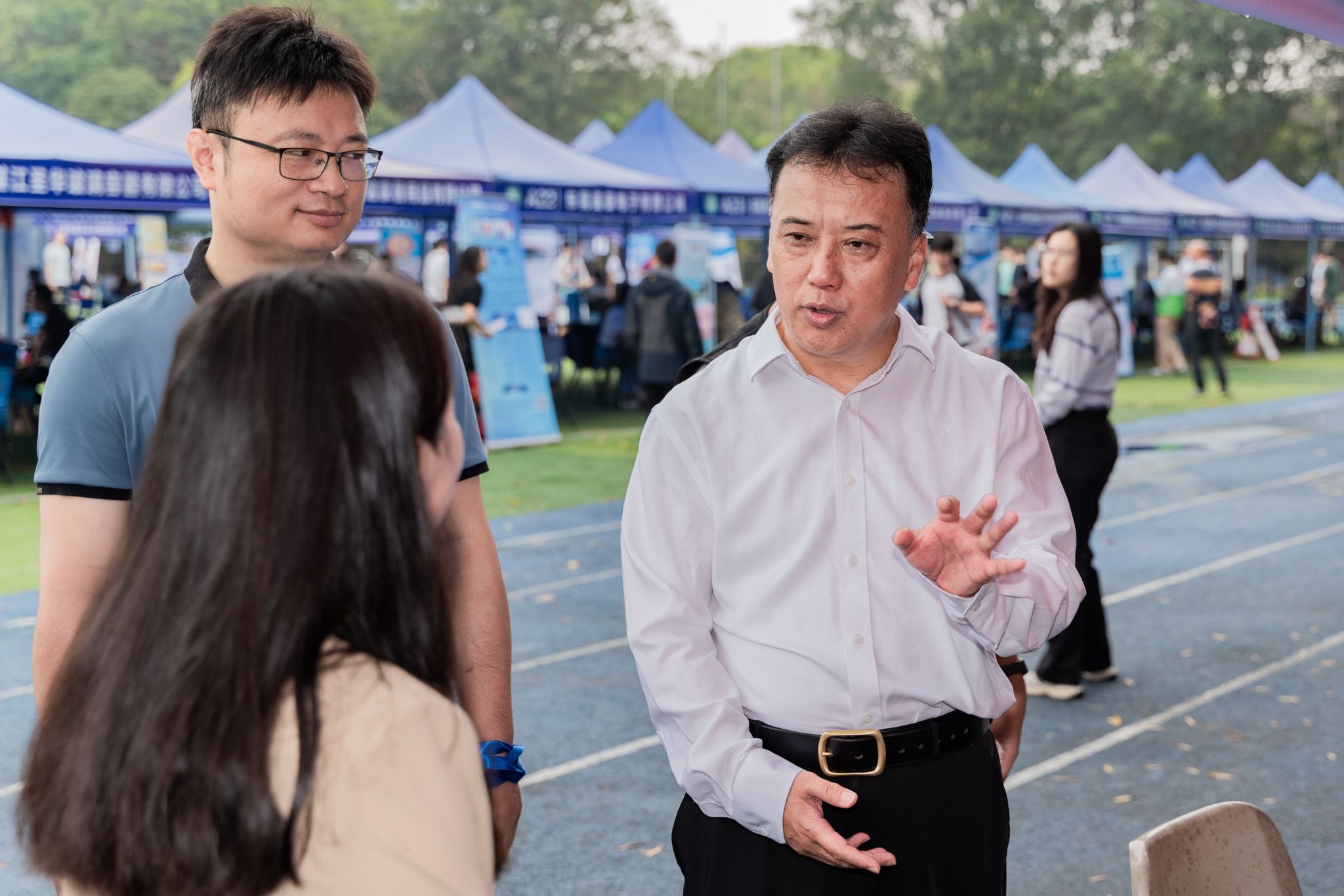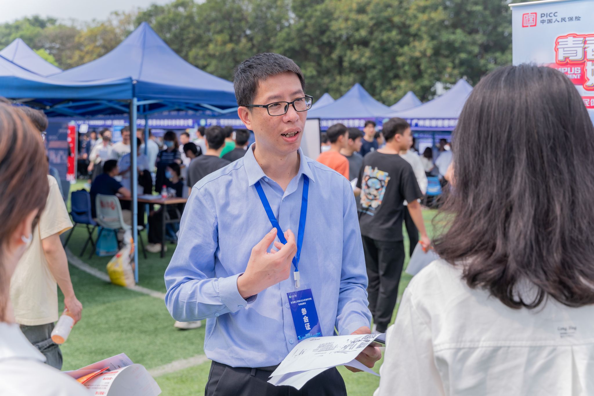 上午9:30,松山湖校区假草田径场热闹非凡。各招聘单位准备就绪,求职者们满怀期待、信心满满,手持简历,寻找心仪的岗位。