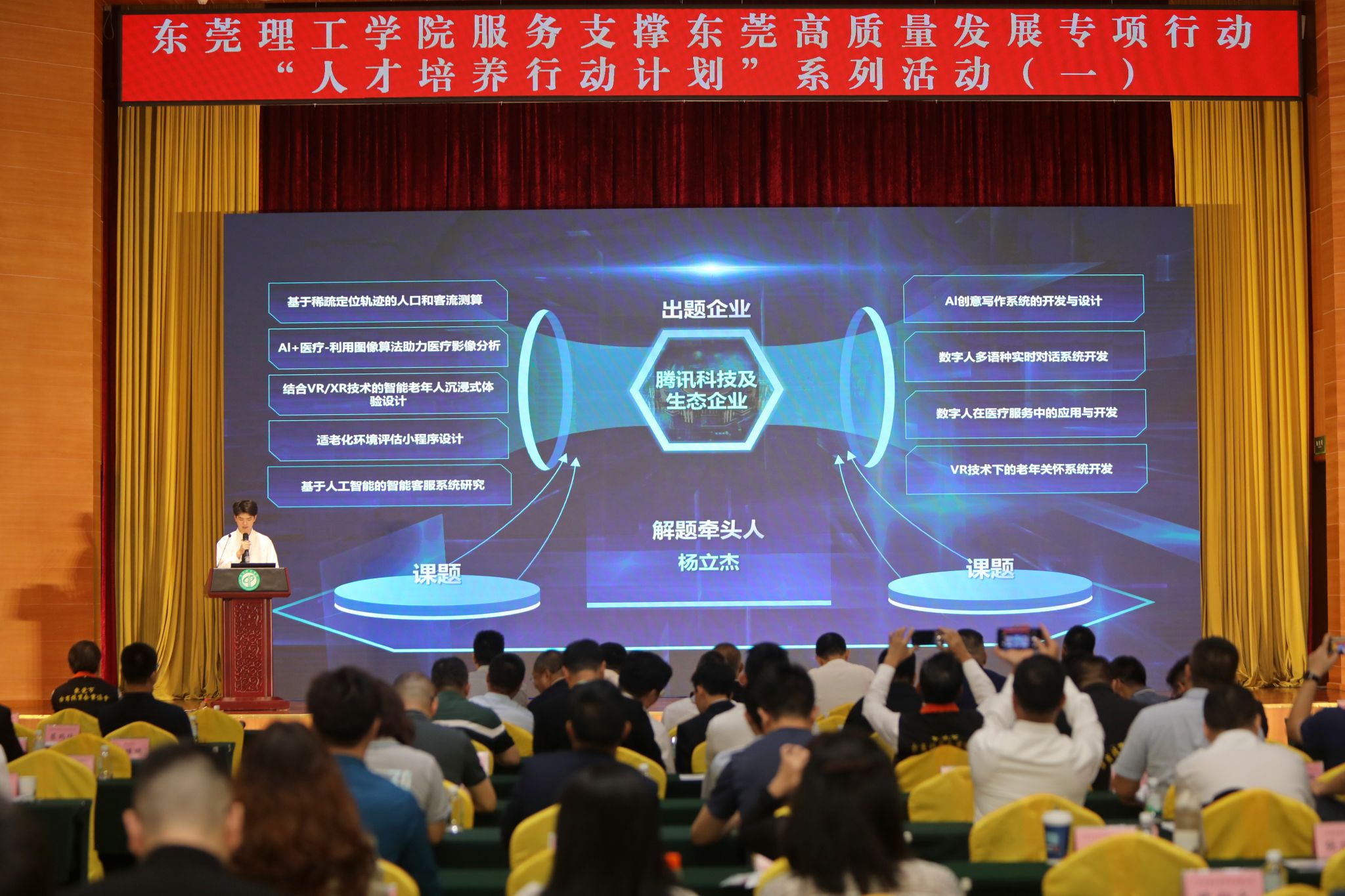 现场,腾讯科技及生态企业、西门子及其生态企业、商汤科技及其生态企业、联想研究院等企业、行业协会提出了90余项课题,涉及人工智能、智慧农业、先进制造业等多个领域,来自我校卓越工程师学院、粤台产业科技学院的10余位教师揭榜领题,接下来将面向全校师生组建相应项目攻坚团队,为企业“答题”,请市场“验题”,解决当前产业一线发展亟需解决的问题,助力东莞产业科技发展。
