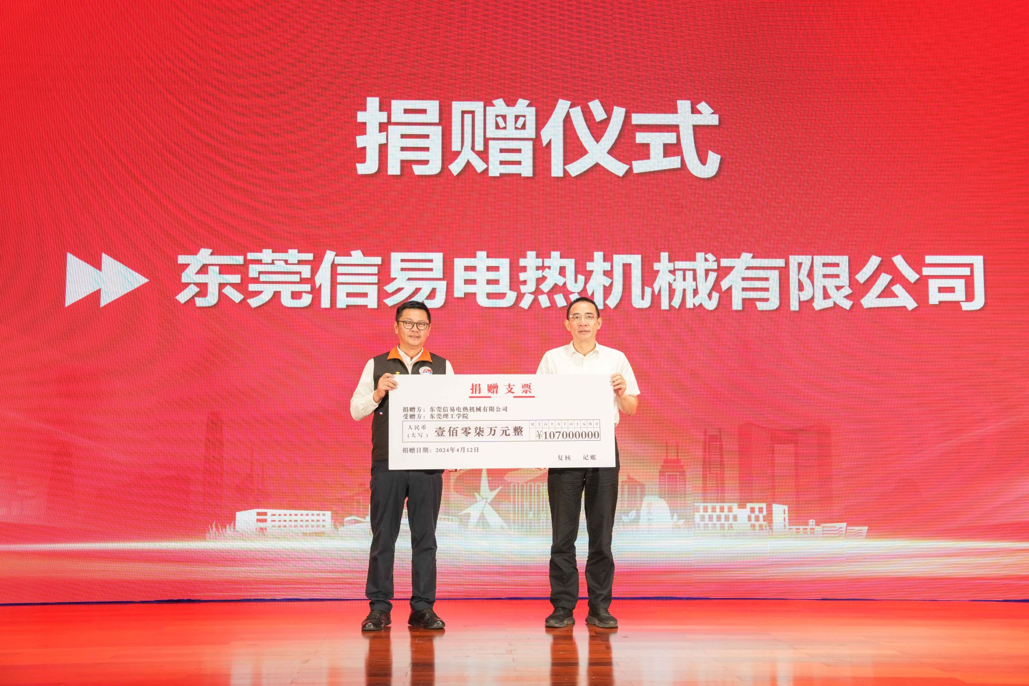 东莞信易电热机械有限公司向学校捐赠107万元,校党委委员、副校长杨敏林代表学校接受捐赠。