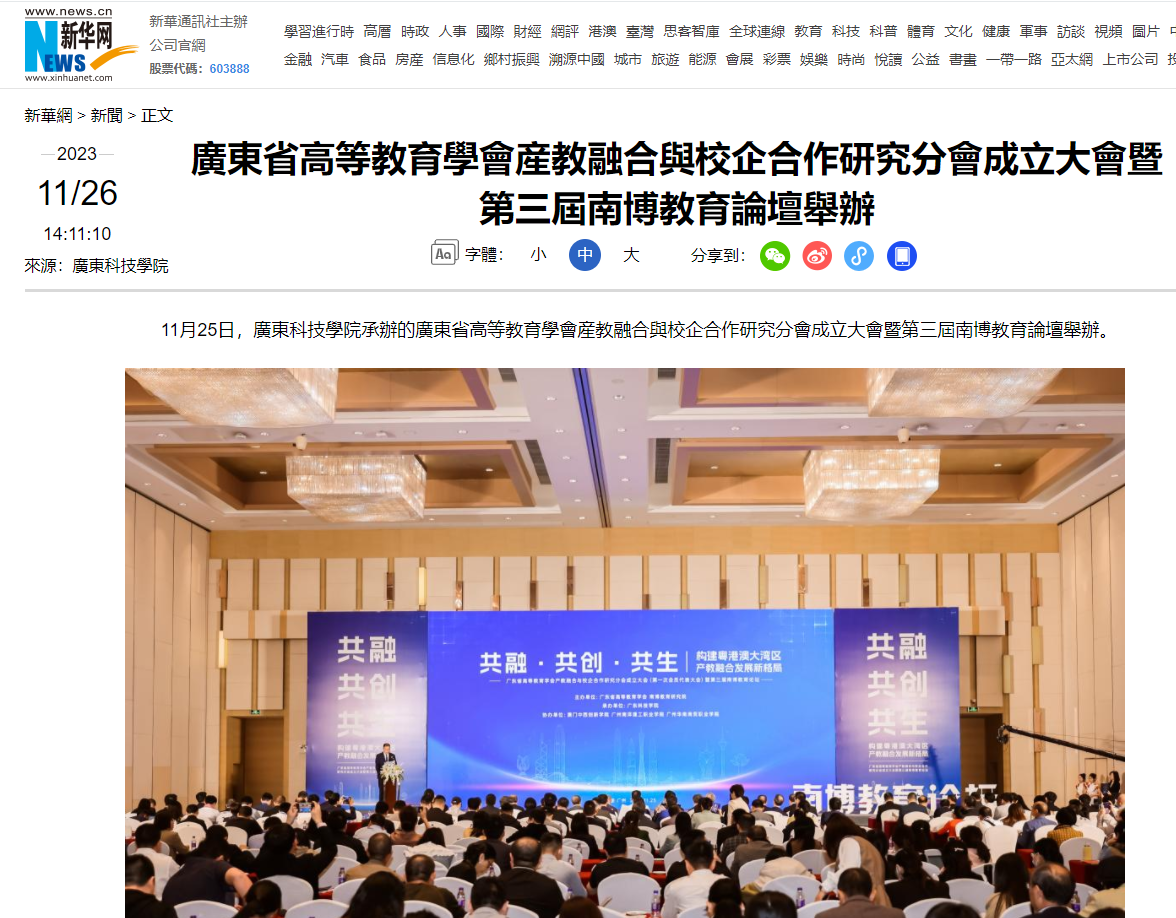 11月25日,广东科技学院承办的广东省高等教育学会产教融合与校企合作研究分会成立大会暨第三届南博教育论坛举办。