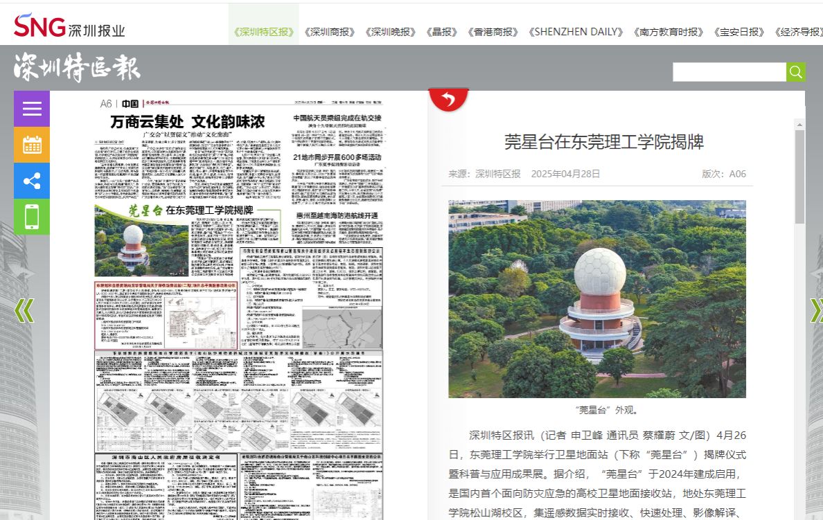 4月26日,九九精品视频一区在线久久久久久久久久毛片精品美女|国产99久久久久久免费看|中文精品99久久国产|国产69精品久久久久9999|精品久久久久久中文字幕无码|亚洲熟妇无码久久精品国产精品99|精品国产天堂综合一区在线举行卫星地面站(下称“莞星台”)揭牌仪式暨科普与应用成果展。据介绍,“莞星台”于2024年建成启用,是国内首个面向防灾应急的高校卫星地面接收站,地处九九精品视频一区在线久久久久久久久久毛片精品美女|国产99久久久久久免费看|中文精品99久久国产|国产69精品久久久久9999|精品久久久久久中文字幕无码|亚洲熟妇无码久久精品国产精品99|精品国产天堂综合一区在线松山湖校区,集遥感数据实时接收、快速处理、影像解译、成果展示于一体,致力于打造成粤港澳大湾区遥感监测与应急服务的重要基础设施。