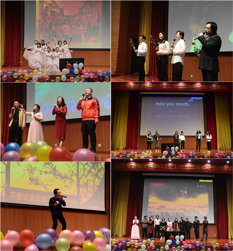 总结会上,学院师生和校友准备了丰富的节目。有学院老师表演的舞蹈《黄玫瑰》,合唱《草原上升起不落的太阳》《真心英雄》《Take me to your heart》《我们•感怀2018》《明天会更好》,独唱《贵妃醉酒》的改编版《青椒醉酒》;学生带来的独唱《Lemon tree》,留学生带来的诗歌朗诵《Where the sidewalk ends》;还有校友带来的合唱《朋友》等等。精彩的节目不仅展现了经管学院师生的多才多艺,更让大家感受到经管学院师生团结和谐、积极向上的良好氛围。总结会在“经济管理、最棒是你”的嘹亮口号中结束。
