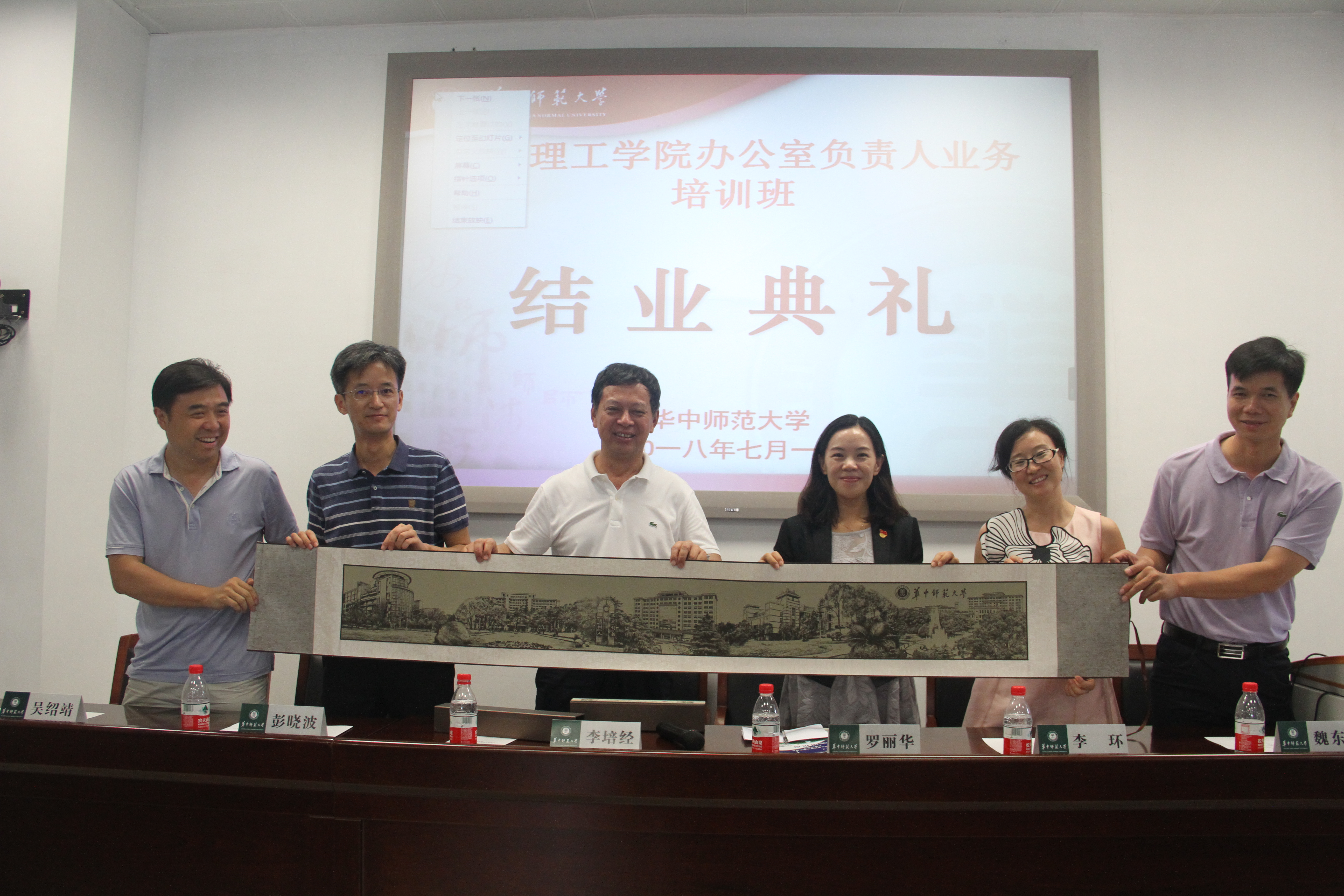 学校高度重视本次培训班,7月1日上午课程培训结束后,党委组织部部长李培经,学校办公室主任彭晓波、副主任魏东初,教师发展中心主任李环从学校赶赴培训现场,专门参加培训班结业典礼。华中师范大学国家数字化学习工程技术研究中心党委书记罗丽华、副主任吴绍靖出席结业典礼并为学员们颁发了结业证书。庞子文、张艳作为学员代表发言。罗丽华表达了主办方的热情及美好祝愿。彭晓波在培训典礼讲话中要求学员们学以致用,努力做到站位高、标准高、品质高,并认真践行习近平总书记在考察中办工作时对党办干部提出的“五个坚持”要求,即“坚持绝对忠诚的政治品格、坚持高度自觉的大局意识、坚持极端负责的工作作风、坚持无怨无悔的奉献精神、坚持廉洁自律的道德操守”。李培经代表学校和罗丽华交换了纪念品,表达了两校进一步加强合作交流的良好愿望。
