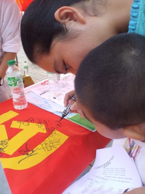 在长盛广场的启动仪式上,志愿者们穿上统一的服装,向过往行人发放宣扬文明礼仪的宣传单张,号召在场市民积极参与倡导文明礼仪行动的签名活动。本次活动得到了许多市民的支持,市民纷纷向在场志愿者们索取宣传单张,并仔细地阅读宣传单张中提到的“文明礼貌三字经”等文明礼仪教育信息,最后还踊跃地在“争做文明市民,喜迎北京奥运”的横幅上签上自己的名字,一些家长更是牵上自己的孩子前来签名,以表明自己对这次活动的渴望和支持,其中一名家长表示:“我们国家正在积极建设和谐的社会,为此,讲究文明礼仪其实是我们每个人都应该做到的,而教育好下一代也正是普及文明礼仪工作的重中之重,作为家长的我们,非常地希望孩子们能从小就培养好文明礼仪的意识,成为一个现代社会的文明人”。