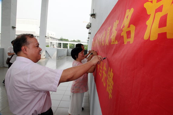党员们在“一诺千金 争做先锋”的横幅上签名为誓。